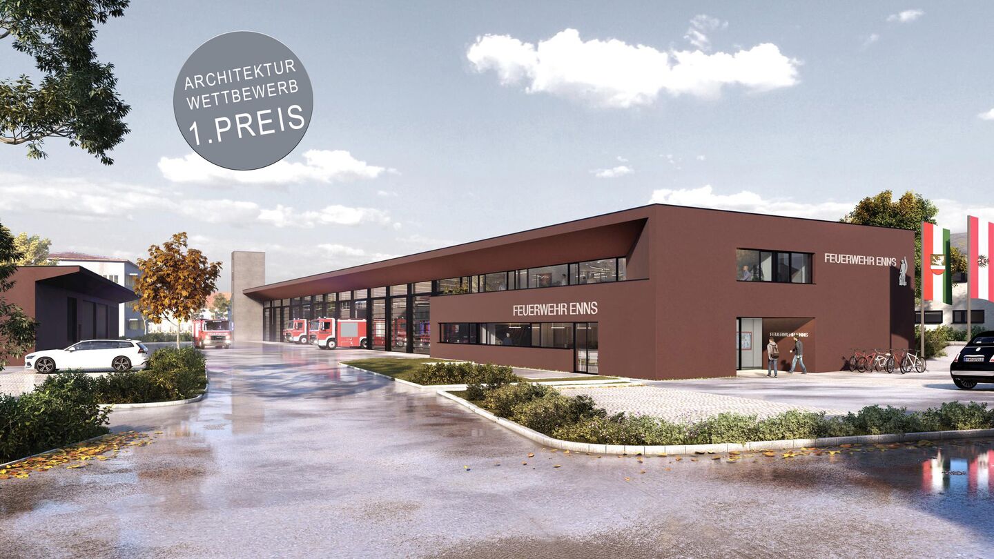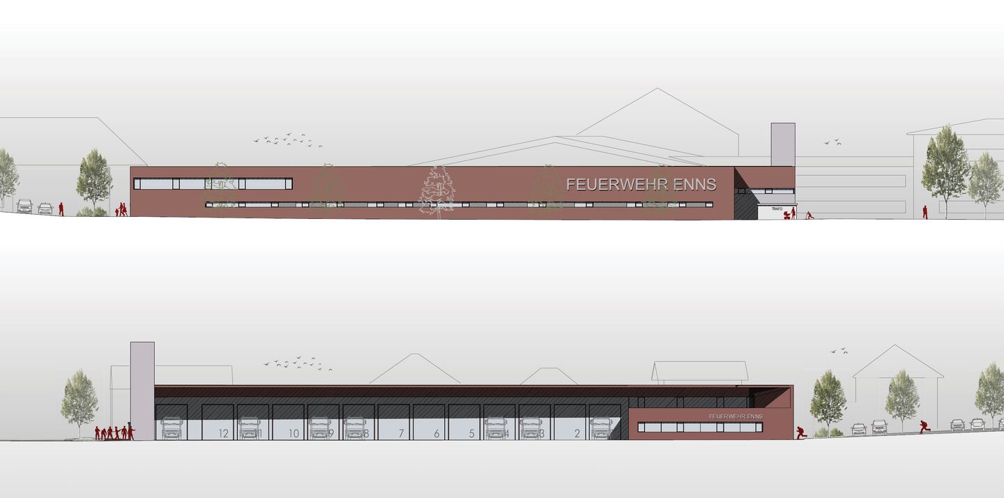 Ein länglicher, klarer Baukörper entlang der Lorcherstraße beheimatet die Freiwillige Feuerwehr Enns. Keilförmig verjüngt sich das Gebäude in Richtung Stadlgasse.