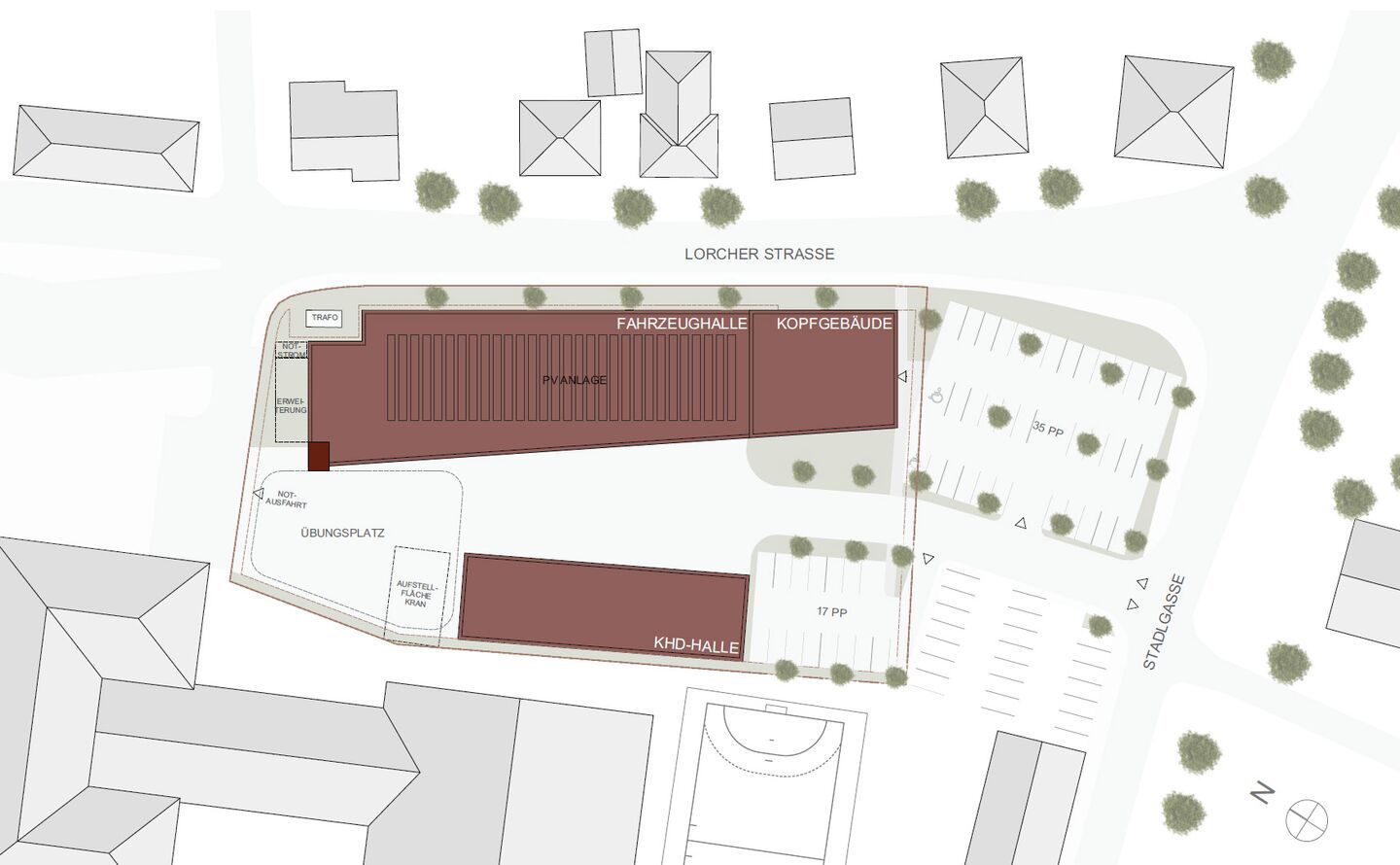 Durch die Platzierung des Gebäudes entlang der Lorcherstraße und den Verzicht eines L-förmigen Baukörpers entsteht ein großer Übungsplatz in perfekter Lage vor dem Schlauchturm. Eine nordseitige Notausfahrt bleibt ohne dem sonst notwendigen Durchfahren einer Garage erhalten.