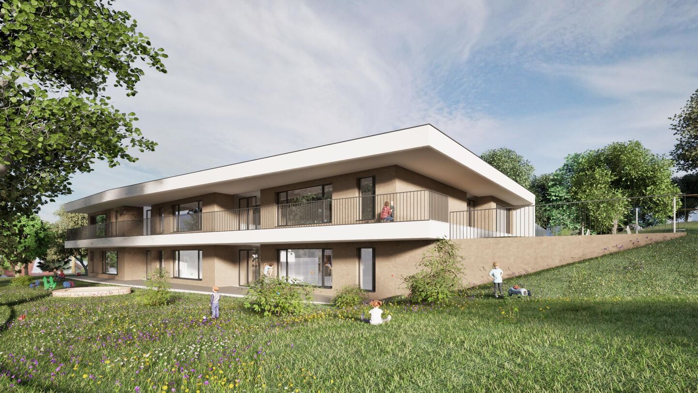 Im Erdgeschoß sind die die Räumlichkeiten der Krabbelgruppe und eine Kindergartengruppe situiert, die im Erweiterungsfall zu einer dritten Krabbelgruppe umgebaut werden kann.