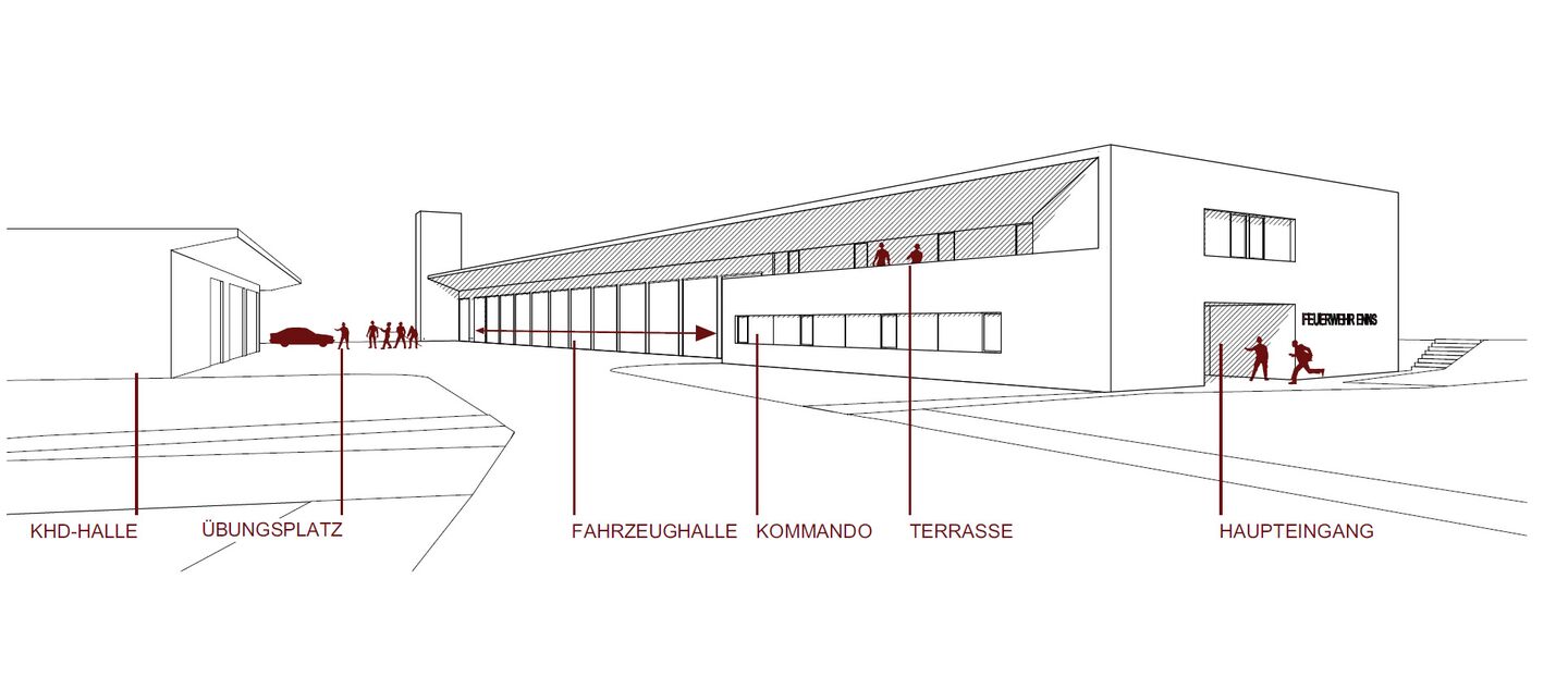 Der Haupteingang orientiert sich zum neu organisierten, südlich gelegenen Parkplatz. Die anrückenden Einsatzkräfte gelangen auf kurzem Wege in die Garderoben und von dort weiter direkt in die Fahrzeughalle. Gegenüber liegend gelangt man in den Bereitschaftsraum mit Teeküche und den Kommandoraum mit Blick auf den Vorplatz und die Fahrzeughalle. Die einfache, lineare Wegeführung ermöglicht stehts beste Übersicht, kurze Wege und somit effizientes Arbeiten im Einsatzfall.